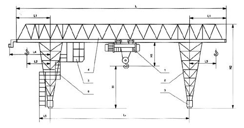 1、葫蘆起升機(jī)構(gòu) 2、支腿 3、大車運(yùn)行機(jī)構(gòu) 4、主梁 5、司機(jī)室 6、梯子、平臺(tái)欄桿安裝